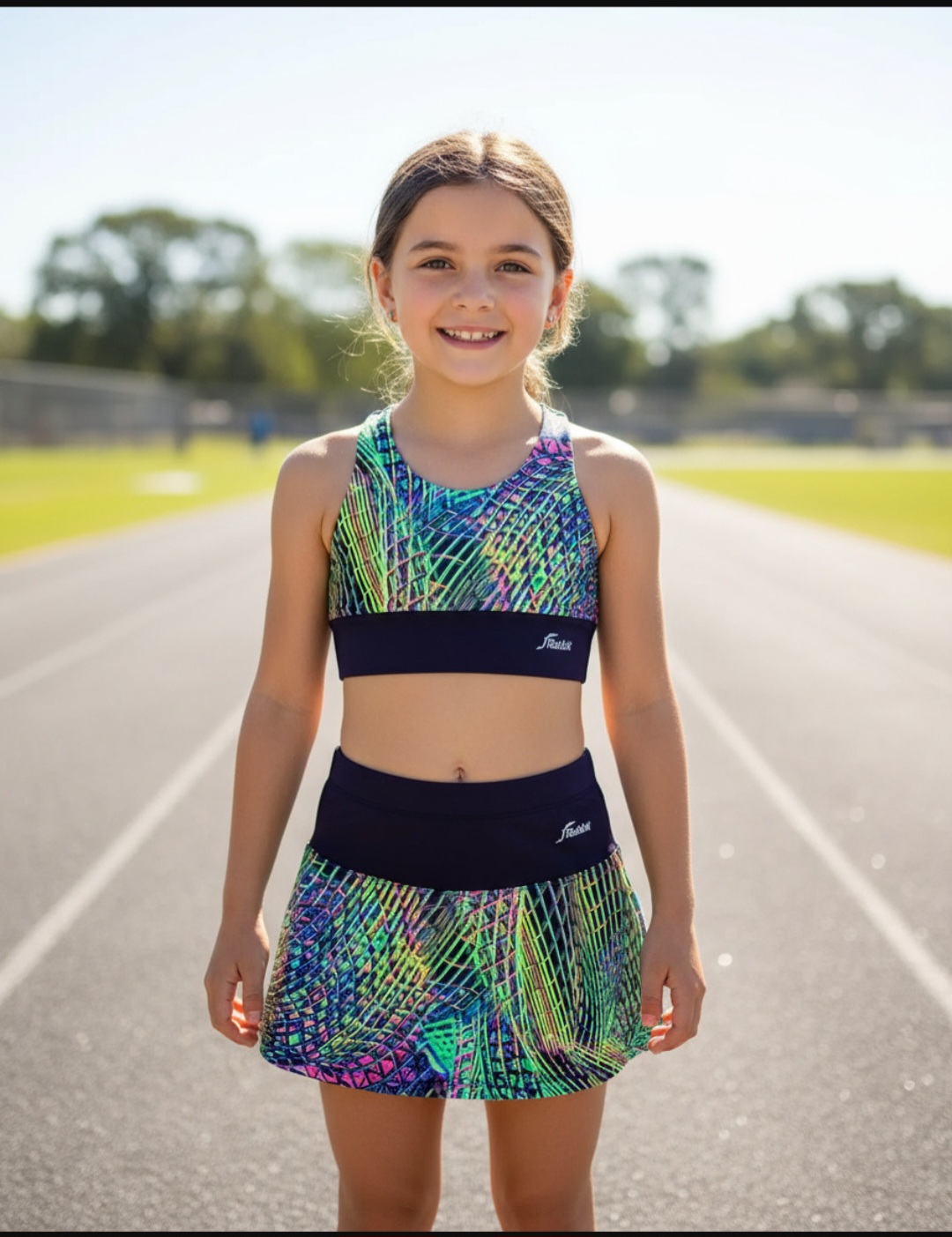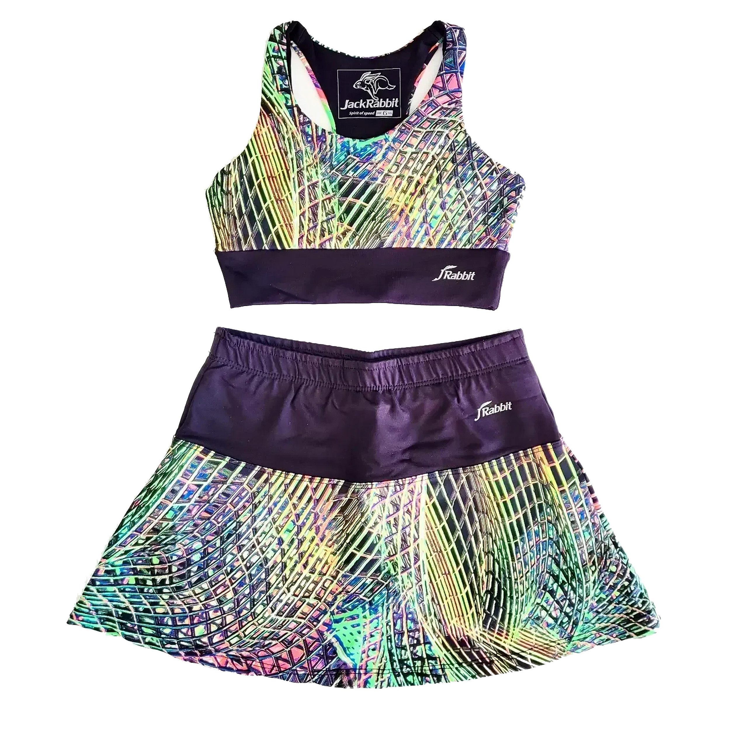 O Top + Shorts-Saia para meninas Jrabbit foi desenvolvido em um tecido leve, que ajuda a manter seu corpo seco e confortável. Cós elástico ajuda a manter o shorts firme e no lugar certo para o esporte e brincadeiras ao ar livre.