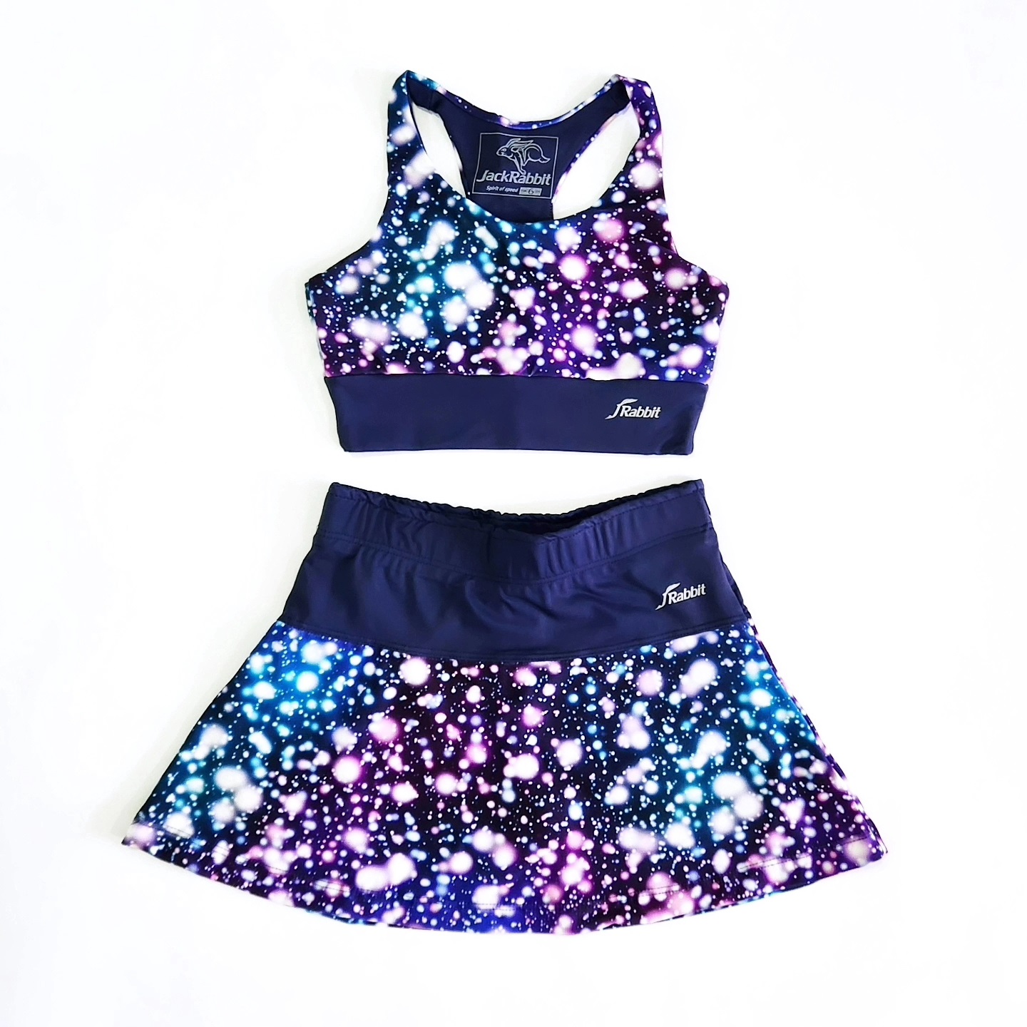 O Top + Shorts-Saia para meninas Jrabbit foi desenvolvido em um tecido leve, que ajuda a manter seu corpo seco e confortável. Cós elástico ajuda a manter o shorts firme e no lugar certo para o esporte e brincadeiras ao ar livre.